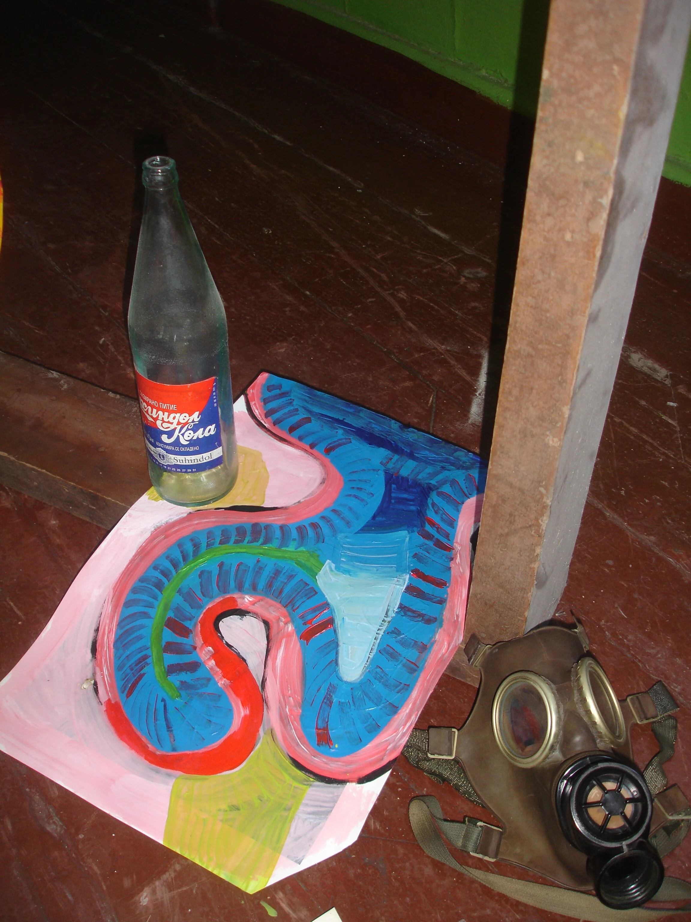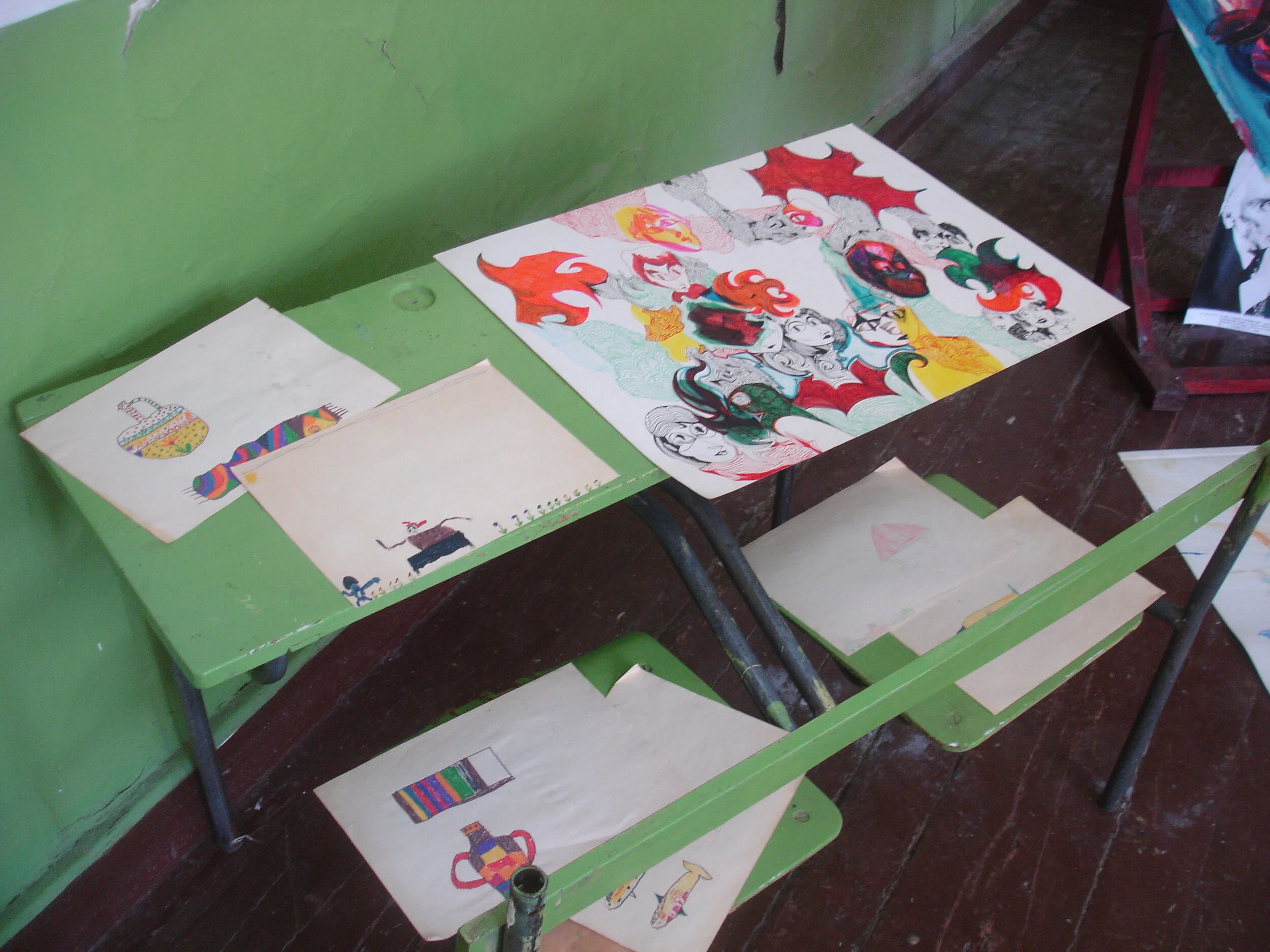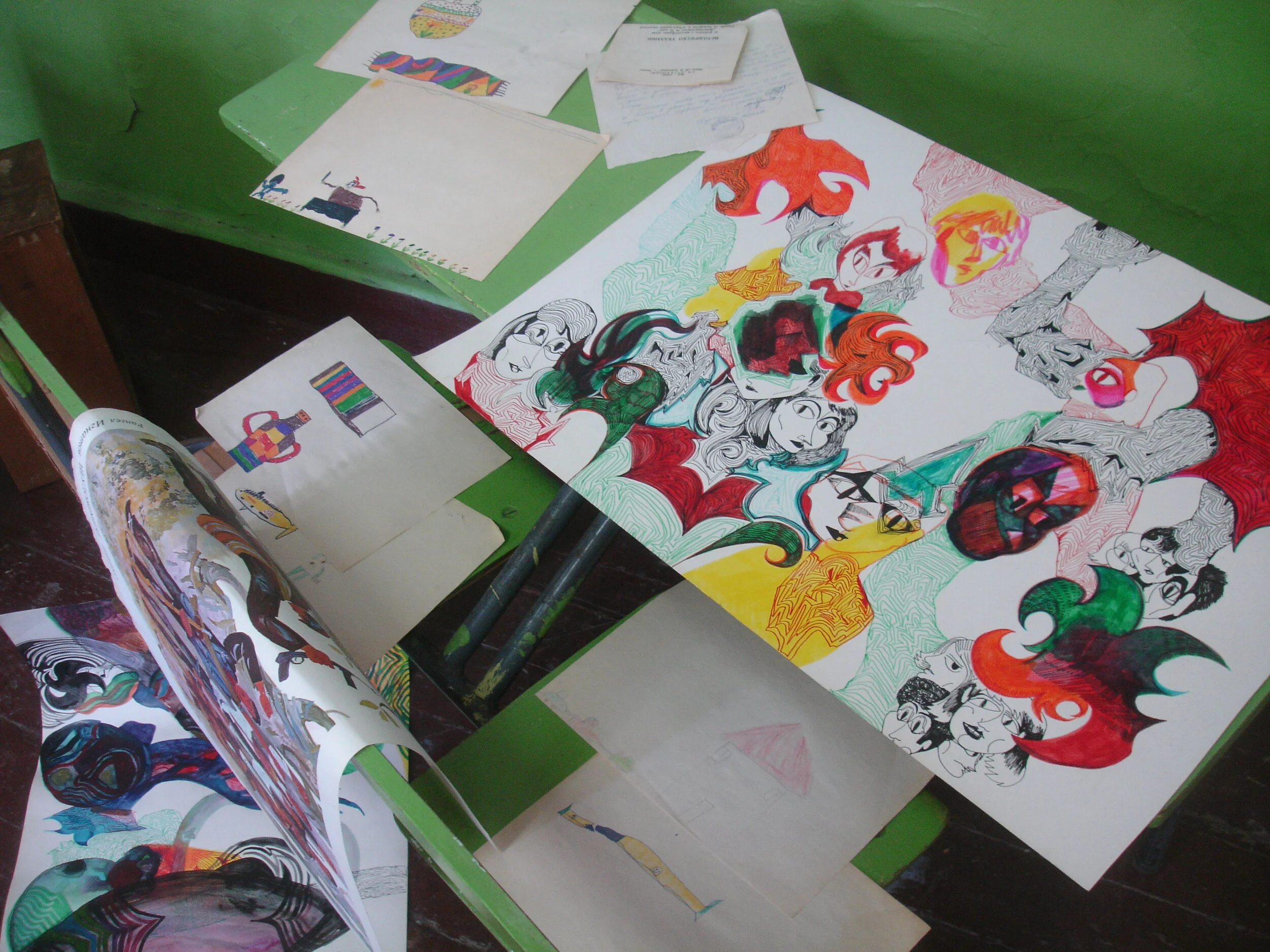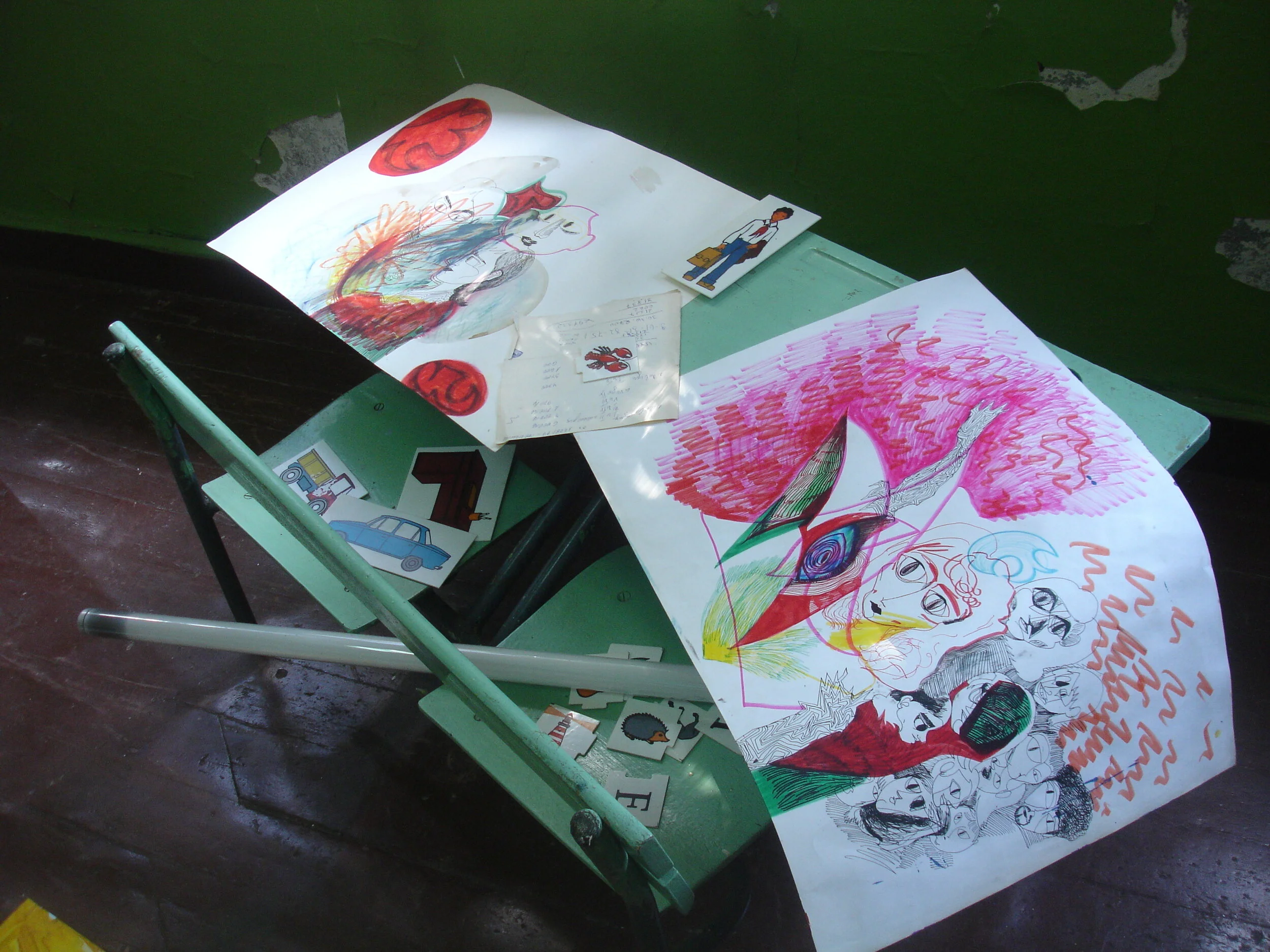 2019, Installation of acrylic and oil paintings on paper, fabric, drawings, found objects (bottles, puppets, photographs, textbooks, lightbulbs), desks and stools, Dimensions variable